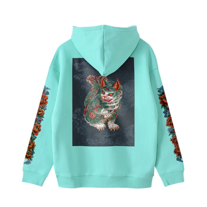 while the back showcases a large, vivid Yokai Cat artwork—turning this hoodie into wearable art.