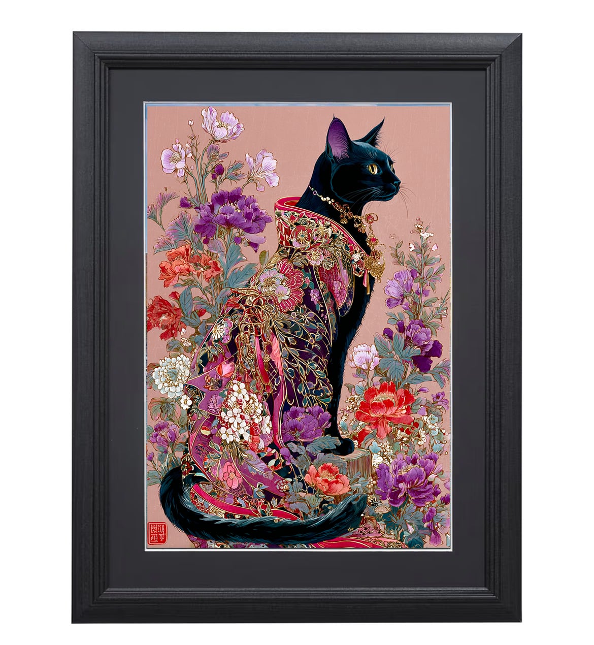 本作品は、猫又庵アートを雲龍紙に印刷、A4サイズのマット付き・額装済み仕様。