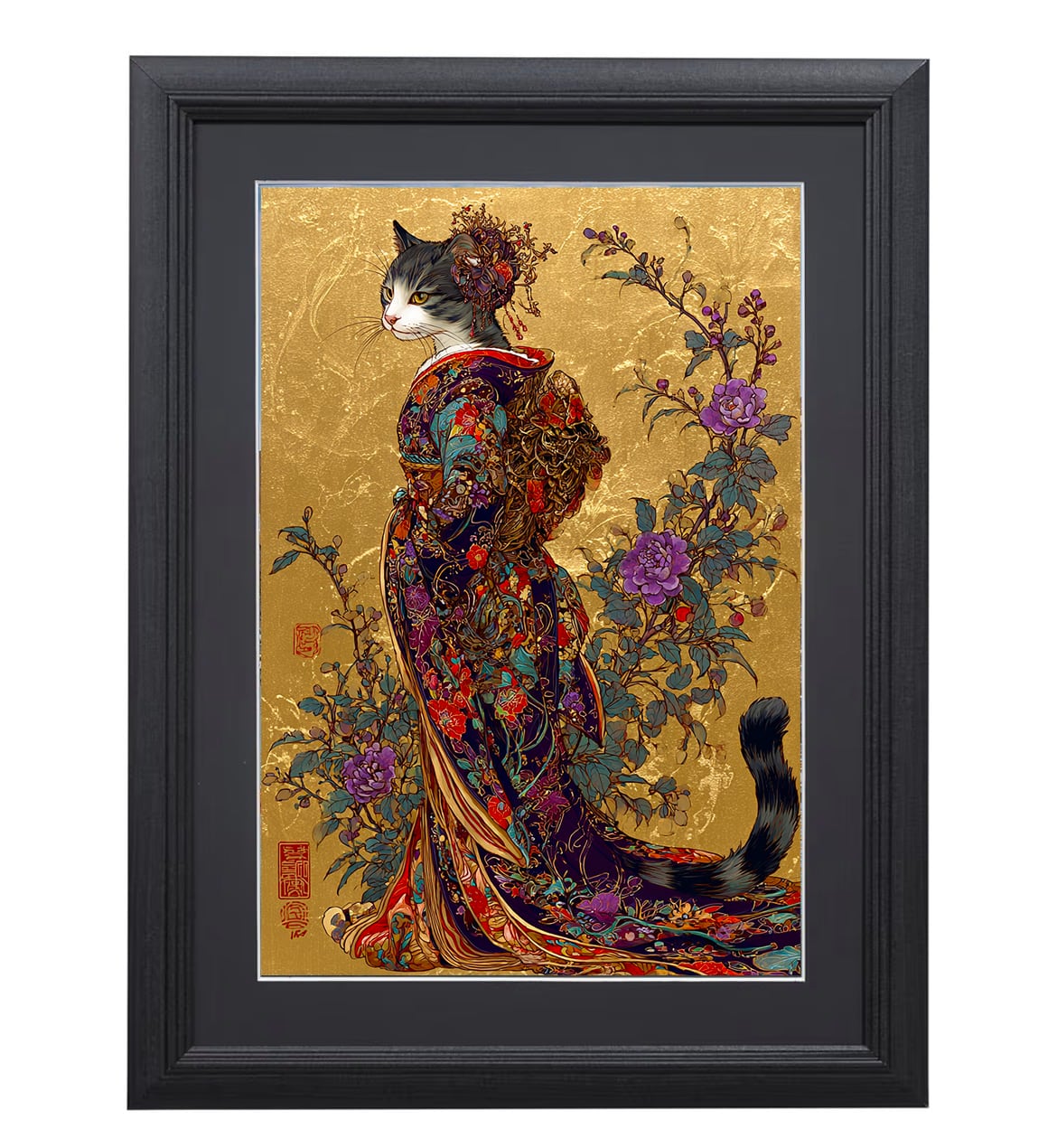 本作品は、猫又庵アートを雲龍紙に印刷、A4サイズのマット付き・額装済み仕様。