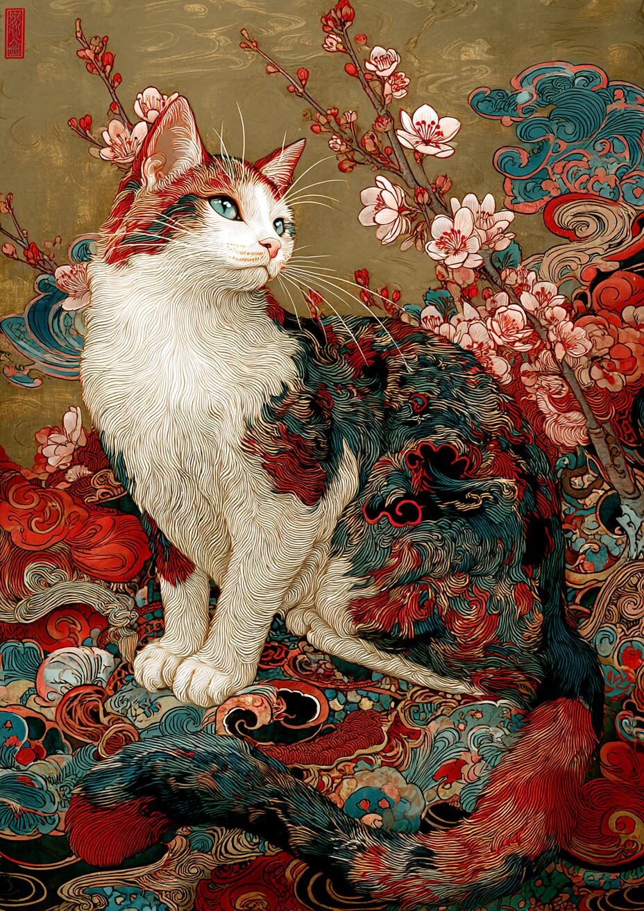 猫の鋭くも優しい眼差しは、移ろう季節の中でも変わることのない「美」の本質を見つめているかのようです。